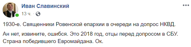 Ан нет, извините, ошибся. Это 2018 год, отцы перед допросом в СБУ. Страна победившего Евромайдана. Ок", - пишет блогер Иван Славинский.