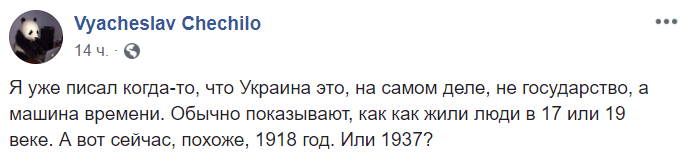 "Я уже писал когда-то, что Украина это, на самом деле, не государство, а машина времени. Обычно показывают, как как жили люди в 17 или 19 веке. А вот сейчас, похоже, 1918 год. Или 1937?", - спрашивает журналист Вячеслав Чечило.