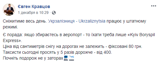 При этом утром 1 декабря, буквально за час до поломки, и. о. главы правления "Укрзализныци" Евгений Кравцов на своей станице в Facebook посоветовал пассажирам в этот снежный день добираться до аэропорта только на экспрессе.
