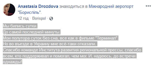 "Мы бились сутки. До самой последней минуты. Мои полтора суток без сна, все как в фильме "Терминал". Но во въезде в Украину мне всё-таки отказали. Спасибо команде Института развития региональной прессы, спасибо всем, кто поддерживал и помогал, чем мог. И, надеюсь, до встречи однажды!", - написала Дроздова.