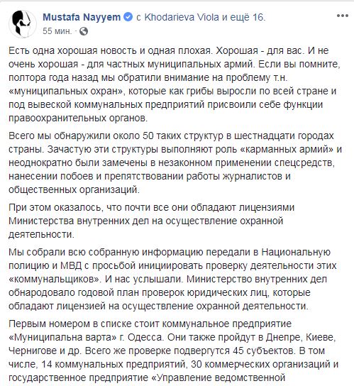 Речь идет о так называемых "муниципальных охранах", которые по всей стране под вывеской коммунальных предприятий присвоили себе функции правоохранительных органов. "Всего мы обнаружили около 50 таких структур в шестнадцати городах страны. Зачастую эти структуры выполняют роль "карманных армий" и неоднократно были замечены в незаконном применении спецсредств, нанесении побоев и препятствовании работы журналистов и общественных организаций", – отмечает Найем. При этом оказалось, что почти все они обладают лицензиями Министерства внутренних дел на осуществление охранной деятельности, напоминает нардеп.