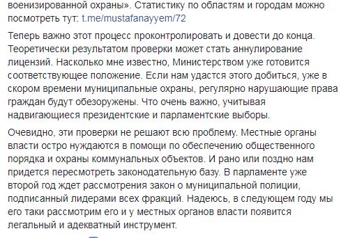 По данным Найема, МВД решило провести проверки у 45 субъектов, в том числе, у 14 коммунальных предприятий, 30 коммерческих организаций и государственного предприятия "Управление ведомственной военизированной охраны". Первым номером в списке стоит коммунальное предприятие "Муниципальна варта" г. Одесса. "Теперь важно этот процесс проконтролировать и довести до конца. Теоретически результатом проверки может стать аннулирование лицензий… Что очень важно, учитывая надвигающиеся президентские и парламентские выборы", – подчеркнул нардеп.