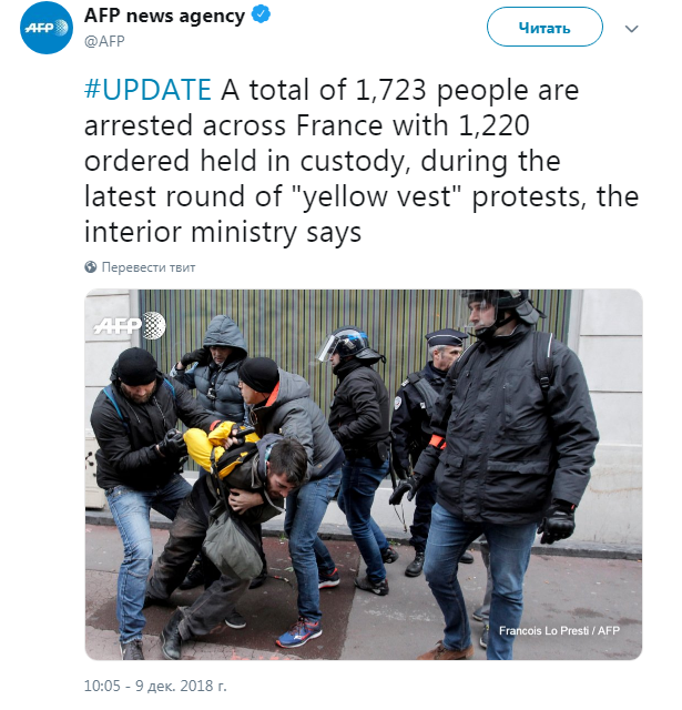 По данным МВД Франции, по состоянию на утро 9 декабря количество задержанных возросло почти на 400 человек - до 1 723. При этом 1 220 человек были заключены под стражу.