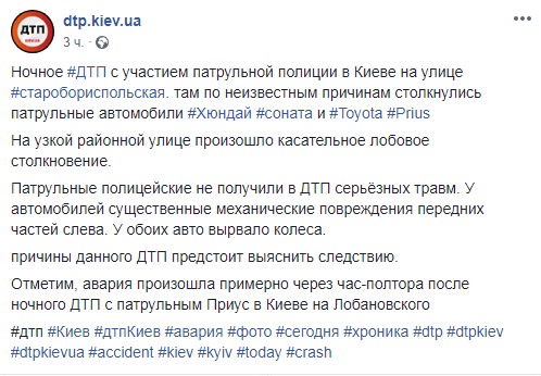 Уже спустя 1-1,5 часа на улице Старобориспольской уже другой служебный Toyota Prius столкнулся с автомобилем Hyundai Sonata. Разбилась левая передняя часть авто, сами патрульные также уцелели. Причина касательного лобового столкновения неизвестна.