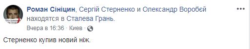 Экс-лидер одесского Правого сектора Сергей Стерненко, которого обвиняют в том, что он зарезал человека, сделал провокационную фотографию на фоне ножа. Об этом сообщил в Facebook волонтер Роман Синицын.