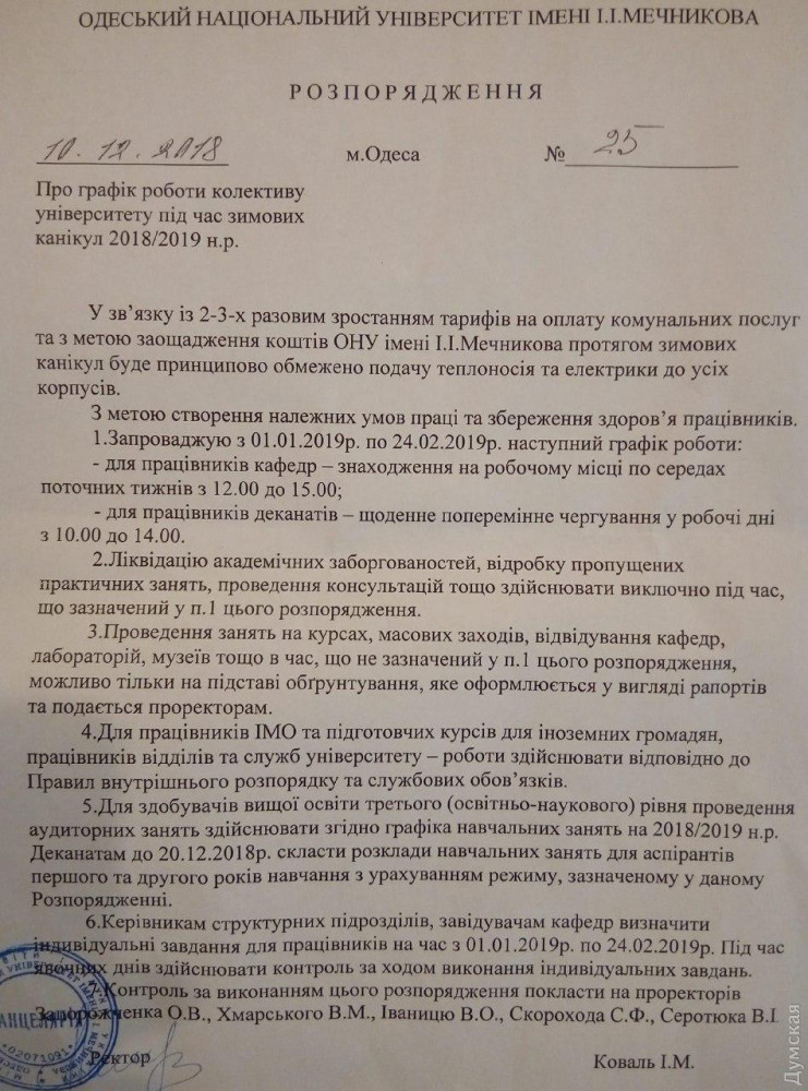 Одесский национальный университет имени Ильи Мечникова с Нового года и до конца февраля будет работать в ограниченном режиме: студентов отпустят на каникулы, а научным сотрудникам запретят задерживаться на рабочих местах. Об этом  пишет "Думская" со ссылкой на распоряжение ректора ВУЗа Игоря Коваля.