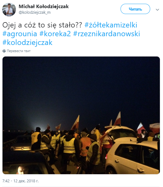 В среду, 12 декабря, польские фермеры устроили под Варшавой несанкционированный протест в желтых жилетах, заблокировав одну из важнейших дорог в стране. Об этом сообщает RMF24.