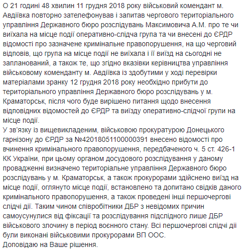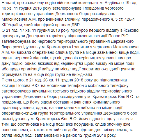 Матиос отметил, что оперативно-следственная группа территориального управления Государственного бюро расследований (ГБР) в Краматорске выехала на место происшествия не сразу. Сначала начальник третьего следственного отдела территориального управления по фамилии Ень сообщил, что "в связи с тем, что обстановка на месте происшествия уже нарушена, следов преступления уже наверное нет, а также темное время суток, оснований для выезда нет, и осмотр места события запланирован на утро 12 декабря". А утром стало известно, что следственная группа вообще не намеревалась выезжать.