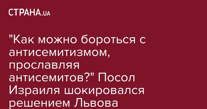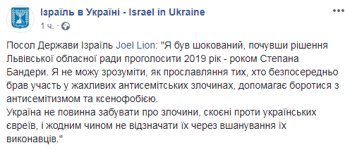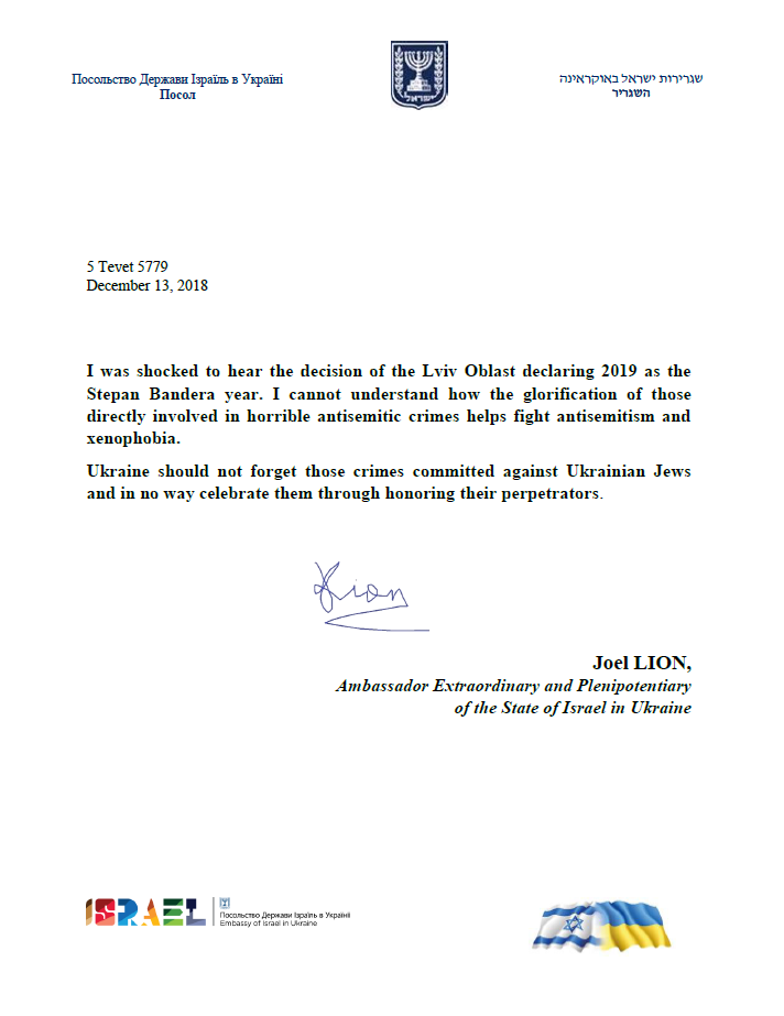 Посол государства Израиль в Украине Йоэль Лион заявил, что шокирован решением Львовской облрады провозгласить 2019-й годом Степана Бандеры. Его открытое письмо было обнародовано посольством Израиля в Facebook.