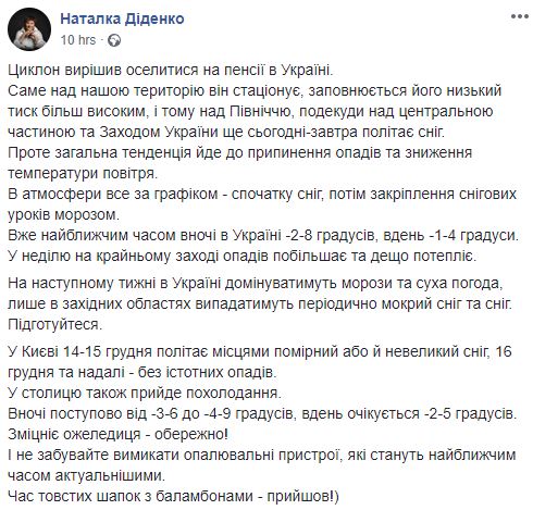 16 декабря в Киеве, отметила синоптик, осадки должны прекратиться.