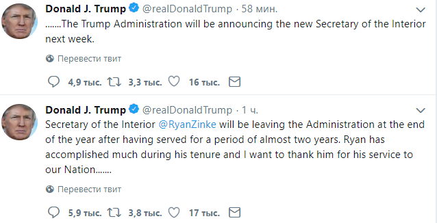 Президент США Дональд Трамп объявил, что министр внутренних дел США Райан Зинке покинет свой пост до конца года. Об этом он написал в своем Twitter.