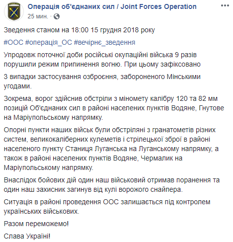 В субботу, 15 декабря, на Донбассе в зоне проведения операции объединенных сил по состоянию на 18:00 боевики 9 раз нарушили "режим тишины", один украинский военный погиб от пули снайпера, еще один ранен в результате боевых действий. Об этом сообщает пресс-центр ООС в Facebook.