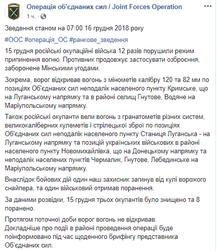 "В результате боевых действий один наш защитник погиб от пули вражеского снайпера, и один военный получил ранения", - сказано в сообщении.