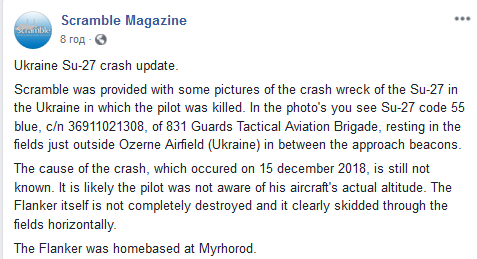 В сети появились фотографии с места катастрофы истребителя Су-27, который рухнул в Житомирской области. Фото опубликовал голландский авиационный ресурс Scramble Magazine в своем официальном Facebook.