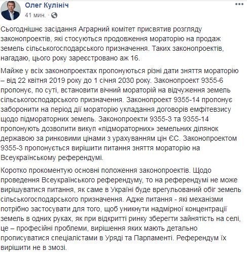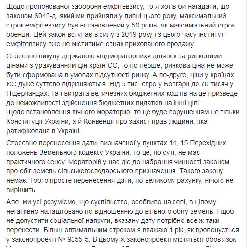 "Оптимальным сроком (продления моратория - Прим. Ред.) я считаю один год, как предлагается законопроектом № 9355-5. В этом же законопроекте содержится обязанность правительства, наконец, подать в Верховную Раду законопроект об обороте земель сельскохозяйственного назначения, который мы уже долго ждем. Мы должны видеть позицию правительства по этому вопросу. Потому я как председатель земельного подкомитета предложил поддержать законопроект №9355-5 и рекомендовать Верховной Раде принять его в целом как закон, что и было поддержано аграрным комитетом", - написал Кулинич.