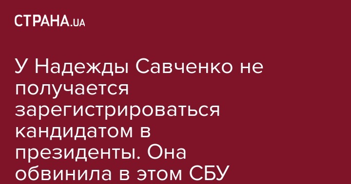 "Служба безопасности Украины неправомерно не допускает ко мне нотариуса. Все начинается с нотариуса. Для того, чтобы я могла стать кандидатом, зарегистрироваться, пройти всю процедуру, мне нужен нотариус. А СБУ всячески блокирует этот процесс", - сказала Савченко агентству "Интерфакс-Украина".