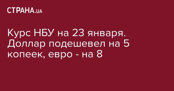 Национальный банк Украины на среду, 23 января, установил официальный курс основных валют по отношению к гривне. По сравнению с предыдущим банковским днем доллар подешевел на 5 копеек. Об этом говорится на официальном сайте регулятора.
