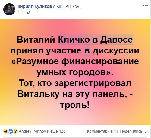 "Виталий Кличко в Давосе принял участие в дискуссии "Разумное финансирование умных городов". Тот, кто зарегистрировал Витальку на эту панель, - троль!"