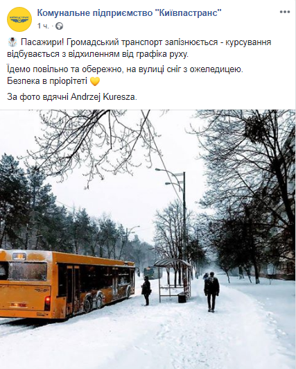 Снегопад спровоцировал не только пробки на дорогах, но и отклонения от расписания движения общественного транспорта столицы. Об этом сообщила пресс-служба "Киевпастранса". Трамваи, автобусы и троллейбусы в Киеве опаздывают, поскольку едут медленнее из соображений безопасности.