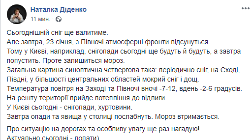 По данным синоптика Натальи Диденко, сегодня будет снежно, но уже 24 января атмосферные фронты переместятся и снегопад в Киеве утихнет, однако останется мороз.