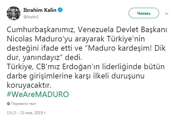 "Наш президент провел телефонный разговор и выразил поддержку Турции президенту Венесуэлы Николасу Мадуро и сказал:" Мой брат, Мадуро! Держись, мы поддерживаем вас!", - написал Калин, добавив хештег #WeAreMADURO (Мы - Мадуро).