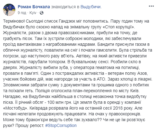 "Список Гандзюк мог пополниться. Пару часов назад на Выдубичах было совершено нападение на съемочную группу "Стоп коррупции". Журналисты, вместе с двумя правозащитниками, прибыли на точку, где воруют песок. Там их встретили вооруженные молодые люди, которые обеспечивали проезд грузовикам с награбленным. Бандиты прыснули газом в лицо журналисту, повалили на снег и начали бить.