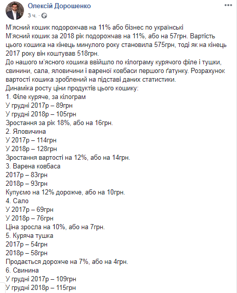 Также Алексей Дорошенко приводит данные касаемо стоимости килограмма каждого из продуктов по состоянию на декабрь 2017 и декабрь 2018 года. Куриное филе подорожало на 16 грн - до 105 грн, говядина прибавила в цене 14 грн и стала стоить 128 грн, вареная колбаса теперь стоит на 10 гривен дороже - 93 грн, сало подорожало на 7 грн и стоит теперь 76 грн, куриная тушка подорожала всего на 4 грн и стоит 58 грн, а свинина прибавила в цене 6 грн и стоит 115 грн.