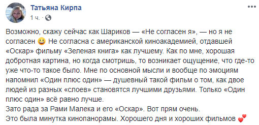 "Возможно, скажу сейчас как Шариков — "Не согласен я", — но я не согласен. Не согласна с американской киноакадемией, отдавшей "Оскар" фильму "Зеленая книга" как лучшему. Как по мне, хорошая добротная картина, но когда смотришь, то возникает ощущение, что где-то уже что-то такое было. Мне по основной мысли и вообще по эмоциям напомнил "Один плюс один" — душевный такой фильм о том, как двое людей из разных "слоев" становятся лучшими друзьями. Только "Один плюс один" всё равно лучше. Зато рада за Рами Малека и его "Оскар". Вот прям очень".