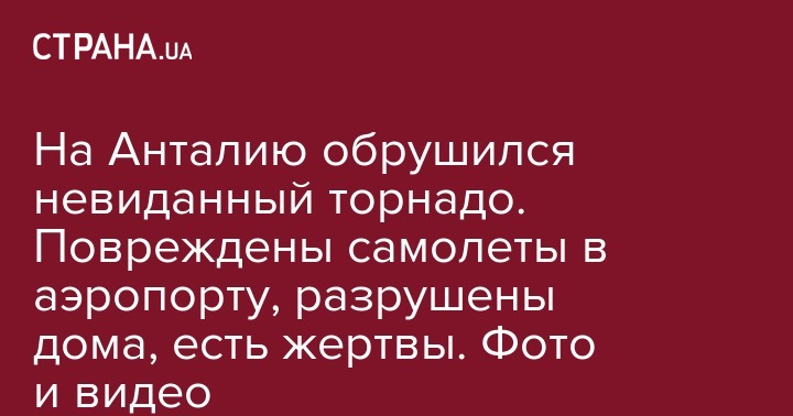Очевидцы сообщают о, как минимум, пяти торнадо, которые нанесли серьезный ущерб центру Анталии. Торнадо сопровождались сильными грозами и градом. Также пострадал аэропорт города, на фотографиях можно увидеть перевернутые автобусы и поврежденные самолеты.
