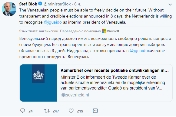 "Если в стране не будет объявлено о проведении свободных, прозрачных и демократических выборов в течение восьми дней, Нидерланды готовы признать Гуайдо временным главой государства", - написал Стеф Блок в служебной записке, направленной национальному парламенту.
