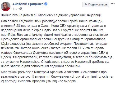 Он добавил, что рассказал о причастности к нападению президента. "Выложил следователю известные мне факты создания по указанию президента организованной преступной группы в составе генерал-майора Юрия Федорова (начальник личной охраны президента), генерал-лейтенанта Виктора Кононенко (заместитель председателя СБУ) и генерал-майора Александра Довженко (руководитель областного управления СБУ в Одессе), которые организовали, руководили бандитами, а теперь их скрывают от задержания Нацполицией", - написал Гриценко.