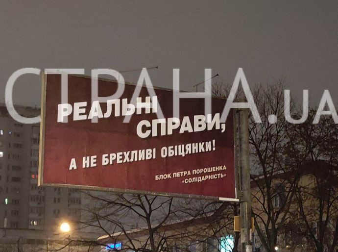 На рекламных площадях, где Петр Порошенко сообщал о получении Томоса, сегодня массово появился новый тезис "Реальные дела, а не лживые обещания". Причем подписан он "Блок Петра Порошенко "Солидарность".