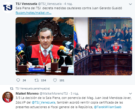 "Верховный суд в решении №1 от 29 января постановил следующие меры в отношении Хуана Херардо Гуайдо Маркеса: запрет на выезд из страны без разрешения до завершения расследования; запрет на продажу активов, находящихся в собственности, а также блокирование доступа и заморозка банковских счетов и/или любых других финансовых инструментов на территории Венесуэлы", - говорится в решении Верховного суда.