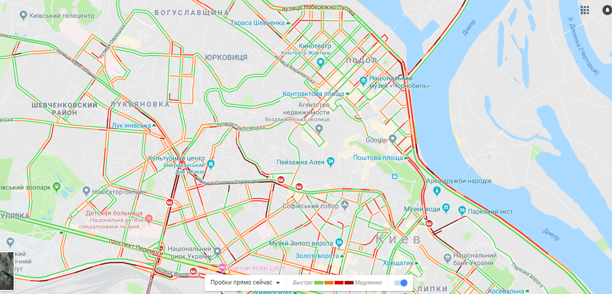Стоят мосты: Южный, Дарницкий, Потона. Труднее всего проехать в сторону центра Киева. На Набережно-Рыбальской и Набережно-Крещатицкой улицах также образовались пробки. Машины стоят и на Броварском проспекте.