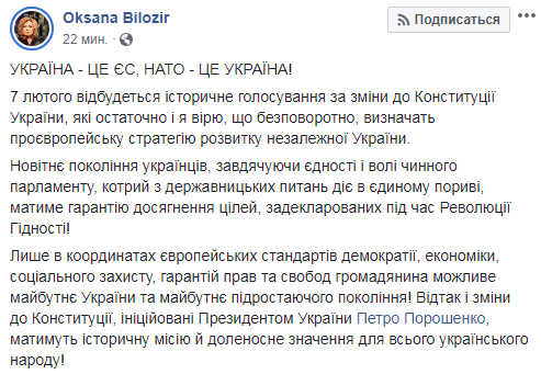 "Новейшее поколение украинцев, благодаря единству и воли действующего парламента, который по государственным вопросам действует в едином порыве, будет иметь гарантию достижения целей, задекларированных во время Революции Достоинства", - говорится на Facebook-странице нардепа от БПП Оксана Билозир, которая и анонсировала голосование.