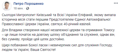 Напомним, Епифаний (Сергей Думенко) был избран предстоятелем ПЦУ на Объединительном соборе в Киеве 15 декабря 2018 года. До этого он являлся епископом УПЦ КП - наместником Свято-Михайловского Выдубицкого монастыря (с 2008 по 2018 год), викарным епископом Вышгородским (с 2009 по 2010 год), митрополитом (на момент окончания служения на кафедре) Переяславским и Белоцерковским (с 2010 по 2018 год), Патриаршим наместником с правами епархиального архиерея (с 2013 по 2018 год).
