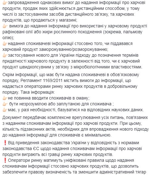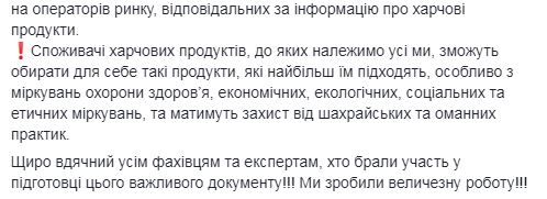 "Этот закон позволит обеспечить высокий уровень защиты здоровья и интересов потребителей путем предоставления всей необходимой информации для осуществления потребителями сознательного выбора пищевых продуктов и ввести ответственность операторов рынка, отвечающих за информацию о пищевых продуктах, за введение потребителей в заблуждение", - написал замглавы аграрного комитета народный депутат Александр Бакуменко (фракция БПП) на своей странице в Facebook.