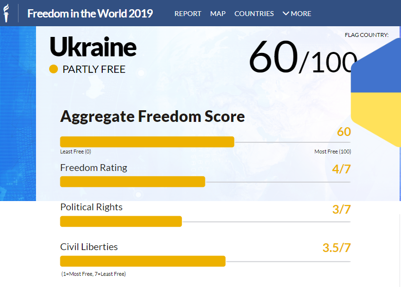 В прошлом году в этом отчете у Украины было 62 балла, то есть за год ситуация со свободой в стране ухудшилась на два пункта.