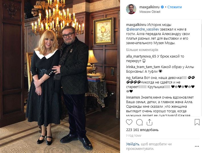 "Историк моды Александр Васильев заезжал к нам в гости. Алла передала Александру свои платья разных лет для выставки и его замечательного музея моды", - написал муж Пугачевой.