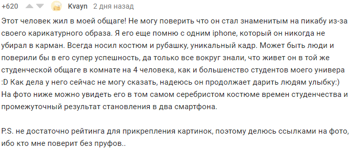 В процессе обсуждения фотографии удалось установить личность ее героя. В комментариях под фото откликнулся человек, который был с ним знаком. По словам пользователя с ником Kvayn, он учился с ним в одном университете и жил в одном общежитии. Kvayn утверждает, что молодой человек всегда стремился к роскошной жизни. "Я его еще помню с одним iPhone, который он никогда не убирал в карман. Всегда носил костюм и рубашку, уникальный кадр. Может быть, люди и поверили бы в его суперуспешность, да только все вокруг знали, что живет он в той же студенческой общаге, в комнате на четыре человека, как и большинство студентов моего универа", - вспоминает юзер.