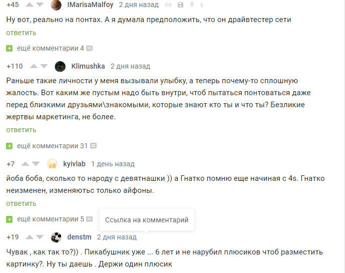Образ вышел достаточно карикатурным, многие пользователи осудили парня за показушность и понтовитость. Фото набрало сотни шуточных комментариев. Посетители портала предположили, что на снимке - создатель онлайн-казино Azino 777 или же "сын подруги маминой подруги". Они также начали выкладывать фото роскошно выглядящих людей, которые встречаются в метро. В частности, нашли "брата" героя фотографии. Им оказался пассажир подземки в деловом костюме с золотыми часами, дорогим телефоном и брелком Mercedes в руке. Также некоторые сравнили парня с образом того-самого человека, который дарит ай-фоны за репосты и лайки в соцсетях.