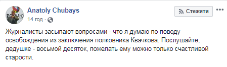 "Журналисты засыпают вопросами - что я думаю по поводу освобождения из заключения полковника Квачкова. Послушайте, дедушке - восьмой десяток, пожелать ему можно только счастливой старости", - написал Чубайс.