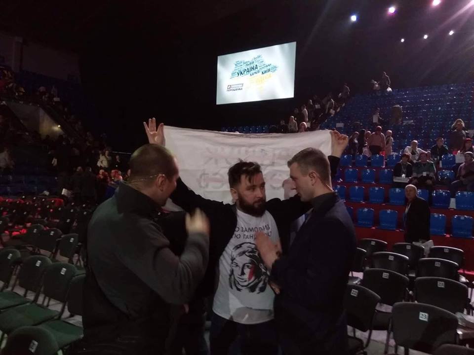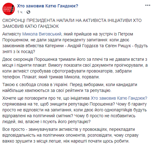 В субботу, 9 февраля, в Киеве на форуме президента Петра Порошенко у активиста Николая Выговского отобрали телефон и порвали плакат с надписью "Кто заказал Катю Гандзюк?". Об этом заявили в сообществе группы на Facebook.