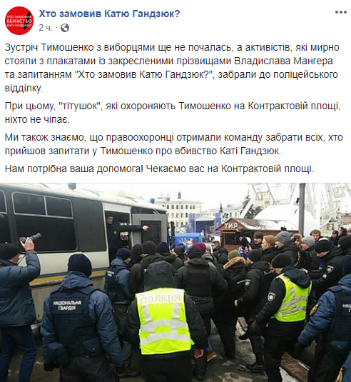 Также сообщается, что перед началом встречи лидера "Батькивщины" Юлии Тимошенко с избирателями на Контрактовой площади в Киеве полиция задержала активистов, которые стояли с плакатом "Кто заказал Катю Гандзюк?". Всех задержанных доставили в Подольское отделение полиции.