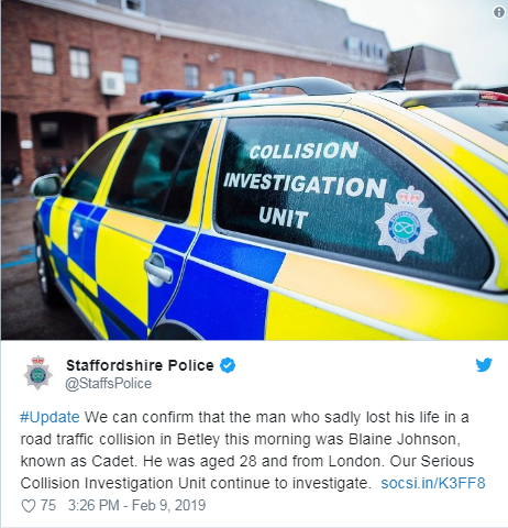 "Мы можем подтвердить, что человеком, который, к сожалению, погиб в результате дорожно-транспортного происшествия в Бетли, был Блейн Джонсон, известный как Cadet. Ему было 28 лет и он из Лондона. Наша группа по расследованию серьезных ДТП продолжает расследование", - передает официальный Twittewr копов.
