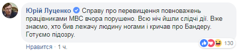 "Дело о превышении полномочий сотрудниками МВД вчера (9 февраля - Прим.Ред.) возбуждено. Всю ночь шли следственные действия. Уже знаем, кто бил лежащего человека ногами и кричал о Бандере. Готовим подозрение", - написал он.