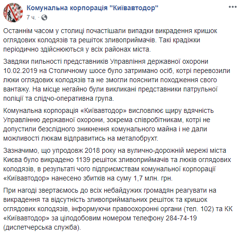 В частности, вчера, 10 февраля, сотрудники Управления государственной охраны задержали на Столичном шоссе лиц, которые перевозили люки смотровых колодцев и не смогли объяснить происхождение своего груза. На место немедленно были вызваны представители патрульной полиции и следственно-оперативная группа.