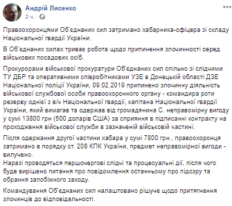 Во время получения взятки был задержан офицер Национальной гвардии Украины. Об этом на своей странице в соцсети сообщает пресс-секретарь Генпрокуратуры Андрей Лысенко, уточняя, что операция проводилась правоохранителями Объединенных сил.