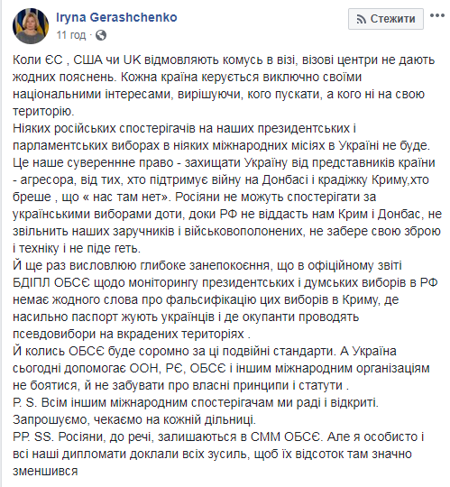 "Никаких российских наблюдателей на наших президентских и парламентских выборах ни в каких международных миссиях в Украине не будет. Это наше суверенное право - защищать Украину от представителей страны-агрессора, от тех, кто поддерживает войну на Донбассе и кражу Крыма, кто врет, что "нас там нет", - написала Ирина Геращенко.