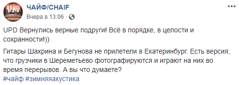 "Гитары Шахрина и Бегунова не прилетели в Екатеринбург. Есть версия, что грузчики в Шереметьево фотографируются и играют на них во время перерывов. А вы что думаете?" - иронично говорилось в сообщении группы в соцсети. Позже появилась информация, что инструменты вернулись к музыкантам в целости и сохранности.